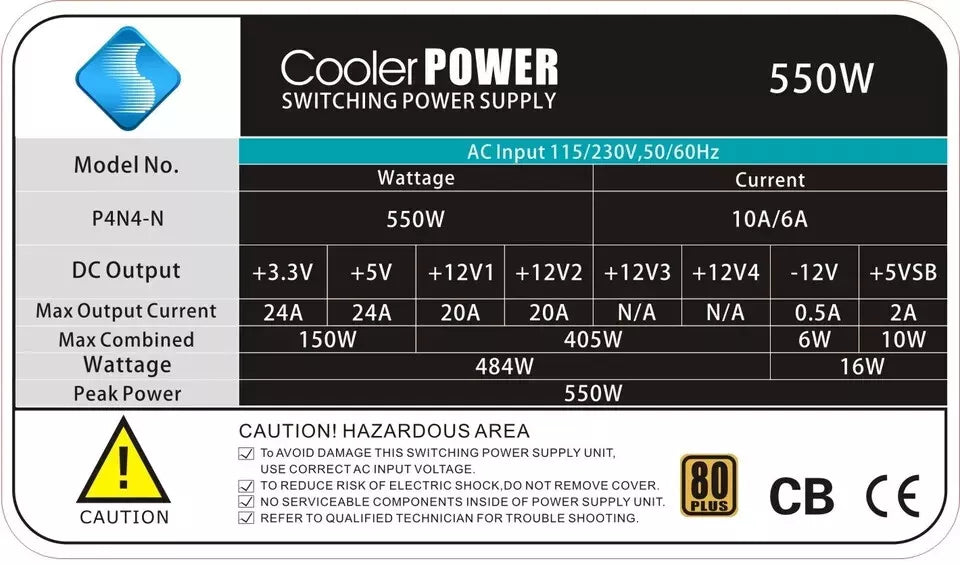 Cooler Power GX550 eXtreme 550W ATX 80 plus Power Supply with 6pin 8pin PCIe
